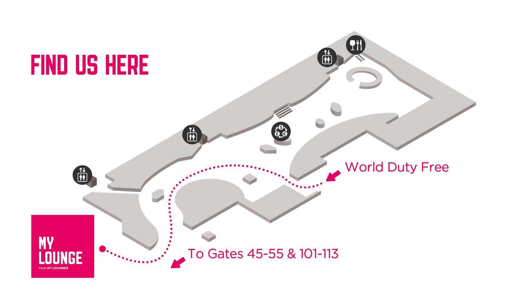 Airside - After passport control and security check, turn left into the main departure hall and follow signs for 'Lounges'. The lounge is located on the left as you enter the Lounge Pavilion.
