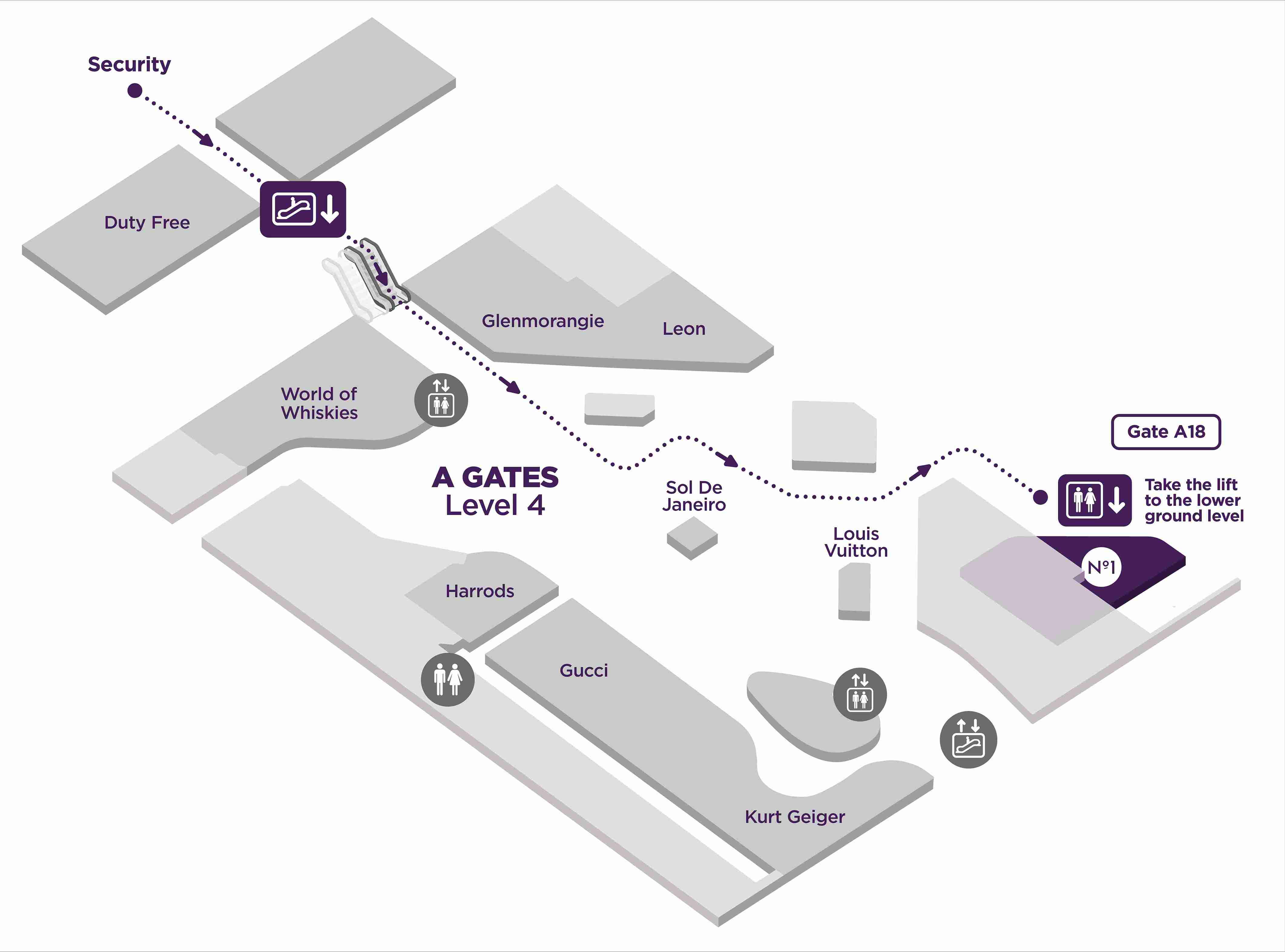 Airside - After passport control and security check, take the nearest elevator to level 4, follow directions to gate A18 and then take the lift to Level 2.